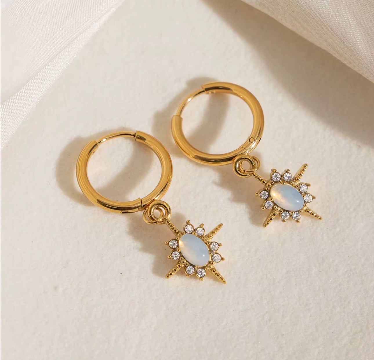 The Lunelle Star Drop Hoops are a delicate yet eye-catching pair of earrings designed for effortless everyday elegance. Featuring a dainty star-shaped drop with a soft opal-style centre surrounded by sparkling stones, these hoops add a subtle celestial touch to any look. Crafted from stainless steel with 18K gold plating, they are waterproof, hypoallergenic, and ideal for daily wear without compromising on style.