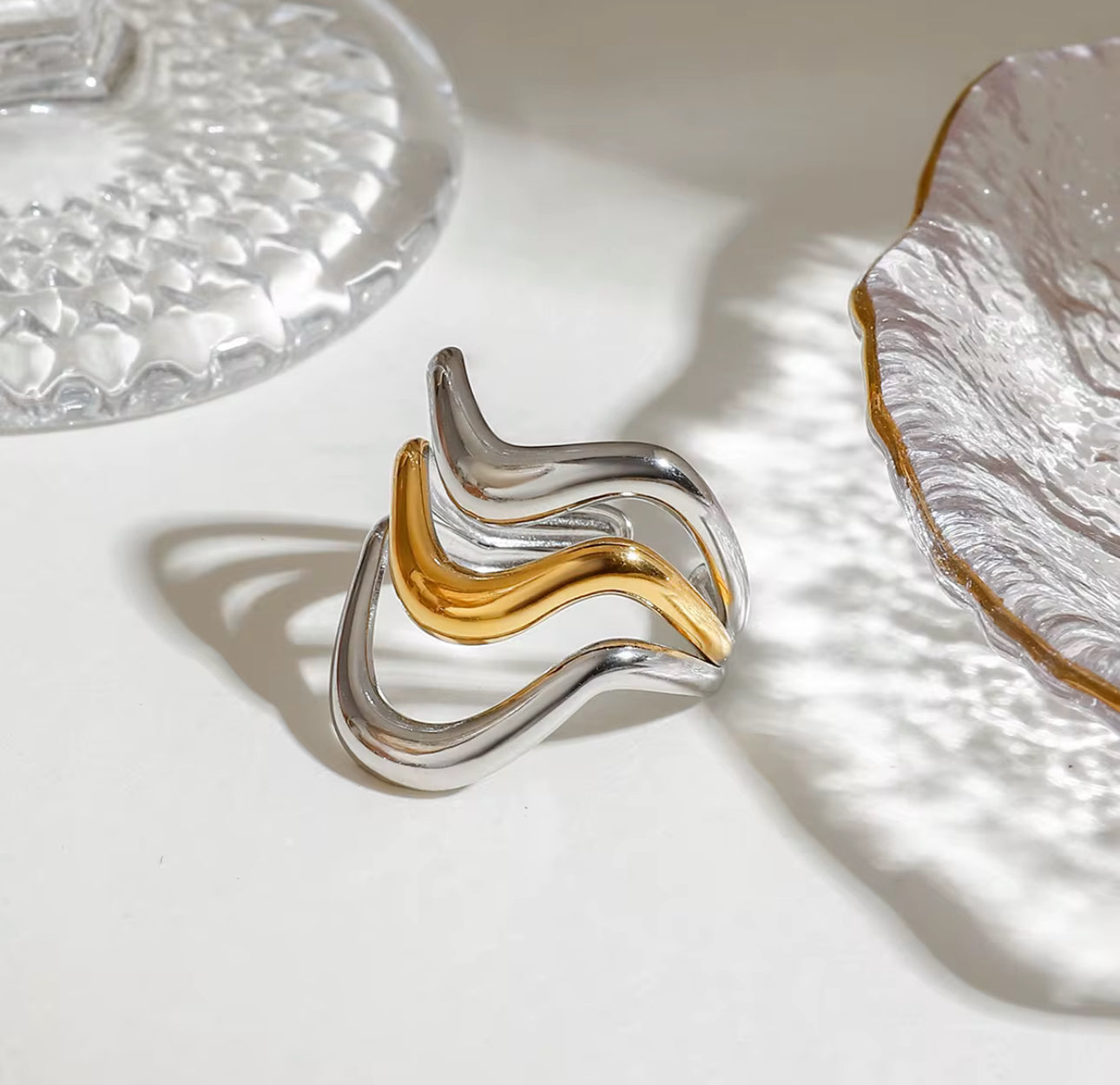 The Aria Wave Ring is a graceful fusion of form and flow, featuring a fluid, double-layer design that dances between two tones — radiant gold and sleek silver. This open geometric ring brings a minimalist touch with a modern edge, making it the perfect accessory for elevating both casual and elegant looks.