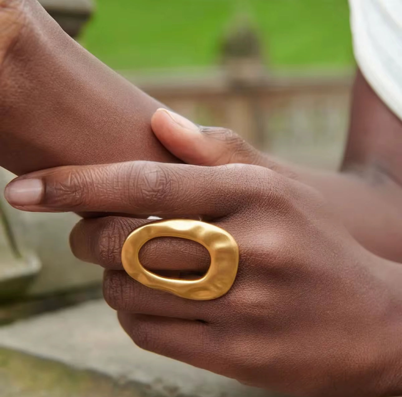 The Liora Gold Ring is a modern minimalist statement piece, showcasing a unique O-shaped open design with an eye-catching hammered texture. This elegant silhouette combines artful imperfection with contemporary polish, perfect for expressing individuality with subtle sophistication.