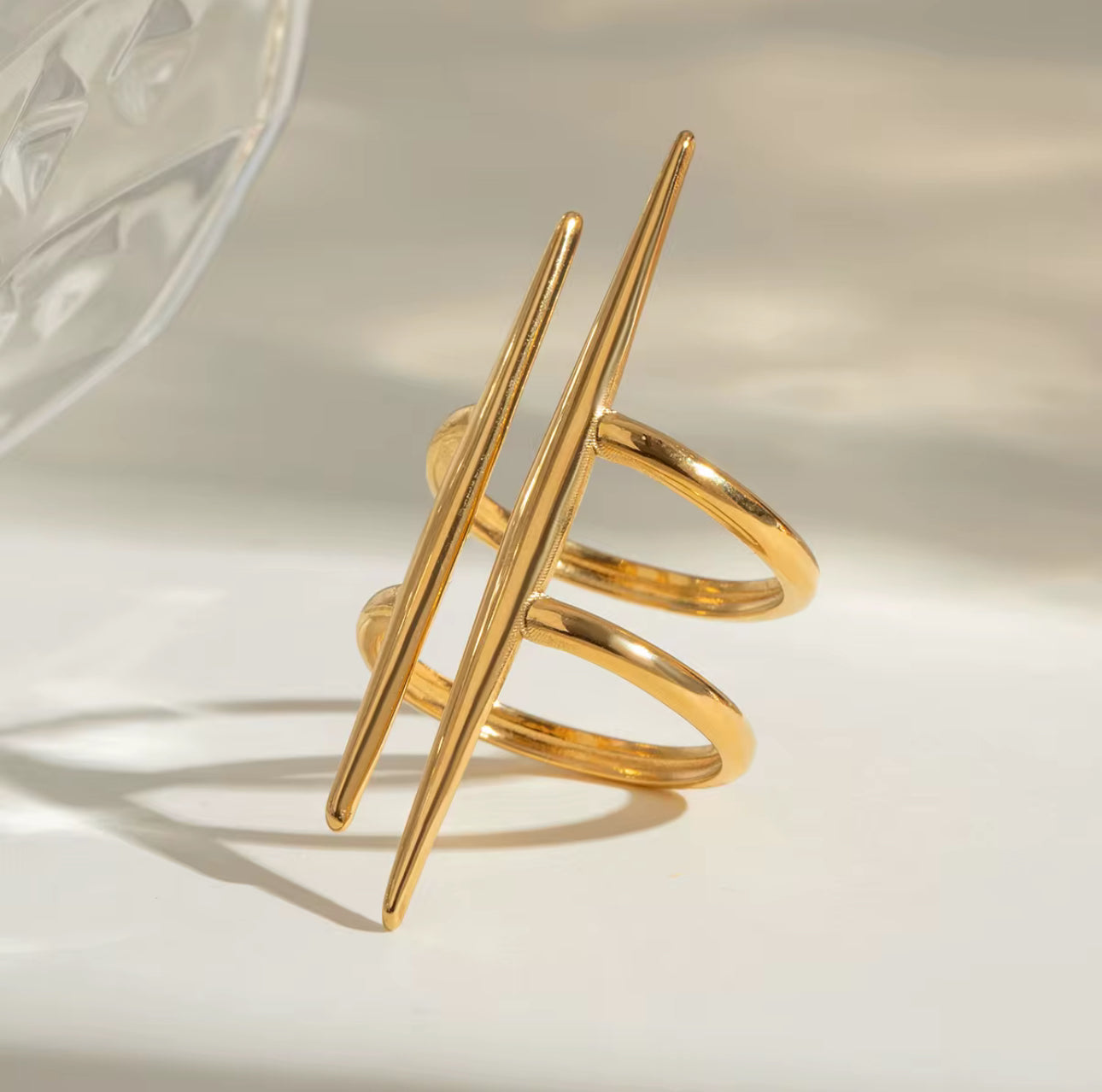 Crafted from stainless steel and finished in radiant 18K gold plating, the Vela Open Ring is waterproof, hypoallergenic, and resistant to tarnishing — designed for effortless, everyday wear with a polished edge.